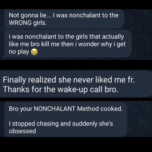 The NONCHALANT Method is a psychological attraction system that helps you build desire through calm detachment—so she feels drawn to you without you chasing.