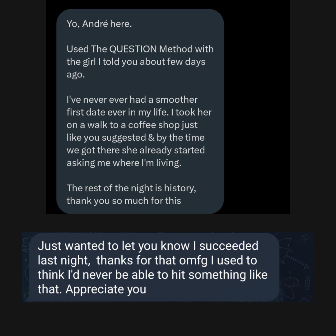 The SEDUCTION Bundle is made of my two bestsellers: The QUESTION Method and The STORY Method, combined into one with a discounted price.That's right, you'll get both of my courses at $20 instead of the price you'd be paying by getting both separately of $25.Using this course, your date will look like this with any girl: